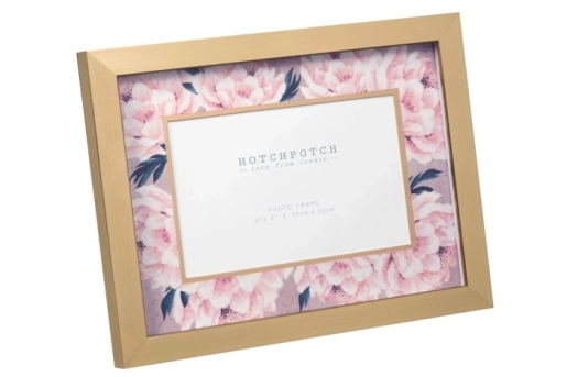 Notre cadre photo onirique présente une élégante bordure dorée ornée de délicats coups de pinceau et un passe-partout illustré de pivoines, dans une palette de couleurs subtiles mêlant rose poudré et vert foncé à un feuillage vert profond. L'ouverture de 10 x 15 cm est encadrée d'une bordure dorée légèrement estompée. Le cadre est fourni avec un support et un crochet mural.