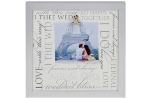 Ce cadre orné d'un motif de feuilles et d'un passe-partout reprenant divers messages d'amour et de mariage, présente l'inscription « Mr. & Mrs. » en relief argenté sous la pince. Conçu pour une photo de 10 x 10 cm immortalisant un mariage ou une lune de miel, il est fourni avec un crochet de suspension et un support.