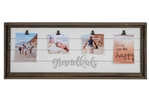 Ce cadre, avec son effet planches de bois naturel et blanc, arbore l'inscription « Petits-enfants » en métal galvanisé découpé, sous une rangée de pinces. Conçu pour deux photos de 10 x 15 cm et deux photos carrées de 10 x 10 cm, il est idéal pour immortaliser les bons moments passés ensemble. Deux crochets muraux sont inclus.