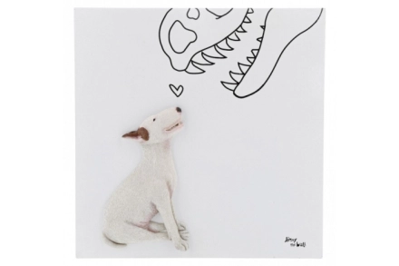 Affichez votre amour pour le bull terrier avec cette superbe décoration murale représentant l'incontournable Jimmy le Bull contemplant avec tendresse un T-Rex. Un must pour toutes les familles amoureuses des chiens.
