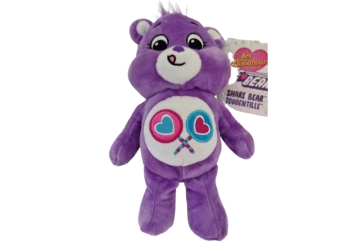 Répandez l'amour et l'amitié avec cette peluche Bisounours Cœur Partagé . Cet adorable ourson violet de la série Bisounours symbolise le partage, la bienveillance et l'amitié. Son ventre arbore fièrement le symbole emblématique du Cœur Partagé , orné de deux cœurs – symbole de chaleur et de lien.