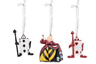 Célébrez les fêtes avec ce ravissant ensemble de trois décorations à suspendre inspirées du monde d'Alice au pays des merveilles . Cet ensemble met en scène l' emblématique Reine Rouge et ses fidèles gardes de cartes . Chaque pièce est confectionnée en polyrésine, peinte à la main et rehaussée d'une subtile couche de paillettes pour une touche festive supplémentaire.