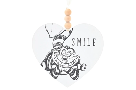 Apportez une touche de fantaisie à votre intérieur avec cette plaque murale en bois , ornée du Chat du Cheshire malicieux d' Alice au pays des merveilles, arborant un sourire radieux à côté des mots « Sourire ». Cette plaque en forme de cœur, mesurant environ 17 x 13,9 cm , est un accessoire joyeux qui égayera instantanément votre décoration.