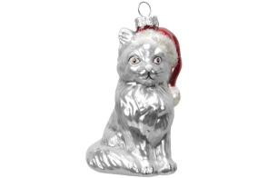 Ce chat majestueux en métal argenté porte un bonnet de Père Noël rouge métallisé orné de guirlandes blanches nacrées et irisées. Une charmante décoration pour le sapin de Noël de tout amoureux des chats, un souvenir précieux à conserver toute une vie. Présenté dans un coffret cadeau argenté avec fenêtre.