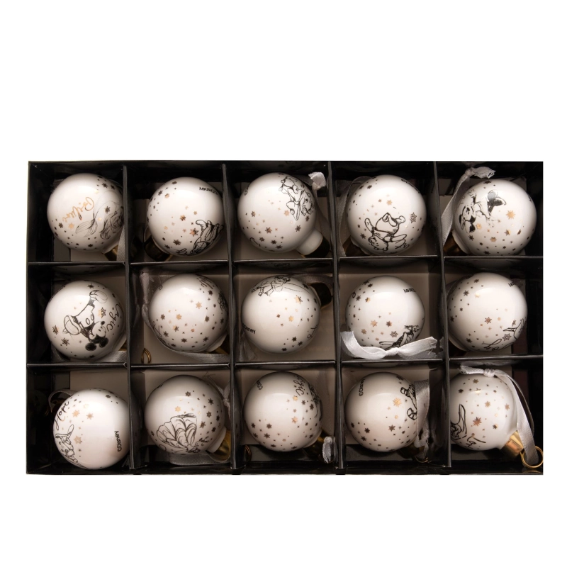 Ce lot de 15 décorations de Noël en céramique apporte la magie et la nostalgie des personnages Disney classiques à votre intérieur. Chaque décoration est soigneusement confectionnée en céramique blanche de haute qualité, ornée de subtils motifs dorés et munie d'un ruban doré pailleté pour une suspension facile. Présenté dans un élégant emballage, ce lot est idéal à offrir ou pour sublimer votre décoration de Noël.