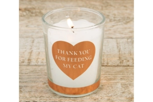 Deze geurkaars van Best of Breed is perfect voor een liefhebber van huisdieren en heeft een hartvormig ontwerp 'Bedankt voor het voeren van mijn kat' in koperfolie.