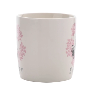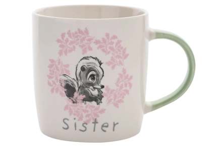Laat je zus weten hoe speciaal ze is met deze stijlvolle porseleinen mok waarop Flower uit Bambi centraal staat, omringd door pastelroze bladeren en afgebeeld met de zilverkleurige tekst “Sister”. Dankzij de inhoud van circa 325 ml is deze mok perfect voor je favoriete warme drank.