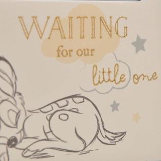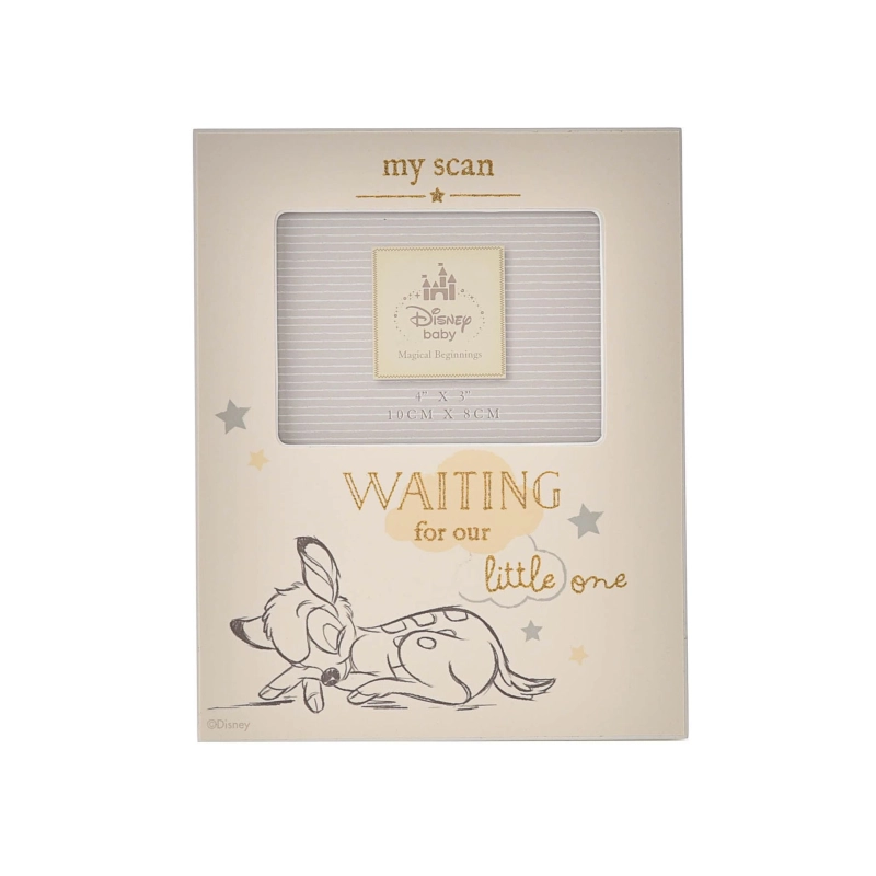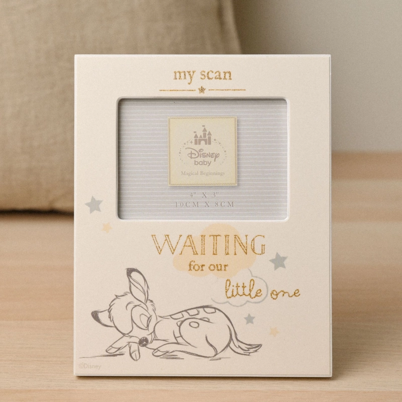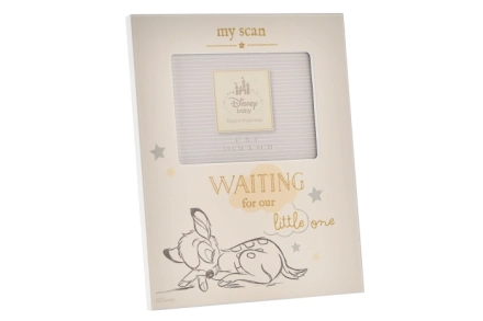 Deze charmante Bambi baby scan fotolijst is onderdeel van de Magical Beginnings-collectie en speciaal ontworpen voor het koesteren van de allereerste echo-foto. Met een zachte, nostalgische illustratie van Bambi en de liefdevolle tekst “Waiting for Our Little One” vormt dit lijstje een prachtig aandenken aan de zwangerschap.