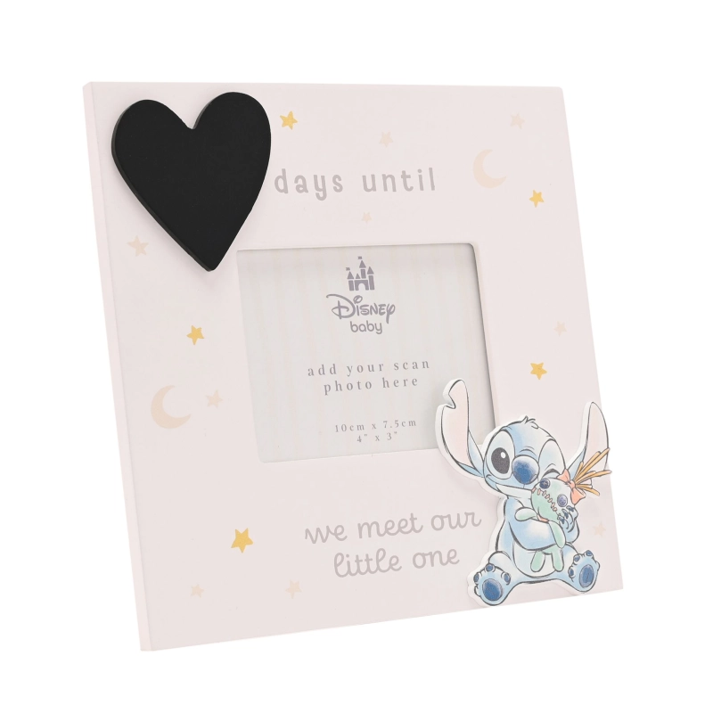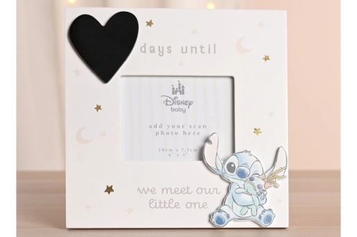 Met de charmante “Baby Countdown Scan Frame” van Disney – met het geliefde figuurtje Stitch – kun je op een originele manier aftellen tot de geboorte. Dit fotolijstje is speciaal ontworpen om een echo-foto vast te zetten, en biedt daarnaast ruimte om de dagen tot de komst van je kindje bij te houden op het zwarte krijtbord-hartje.