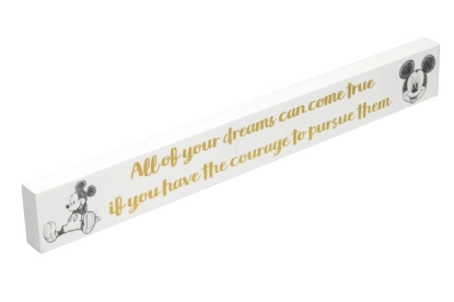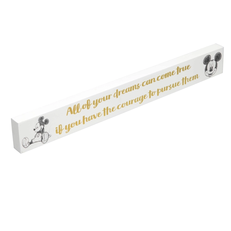Verfraai je interieur met deze elegante mantelplaat featuring Mickey Mouse in klassieke zwart-wit illustratie. De plaat is uitgevoerd in helder wit met verfijnde potlood-stijl illustraties en een subtiele gouden quote: “All of your dreams can come true if you have the courage to pursue them”. Een stijlvolle en positieve decoratie voor woonkamer, slaapkamer of kantoor.