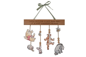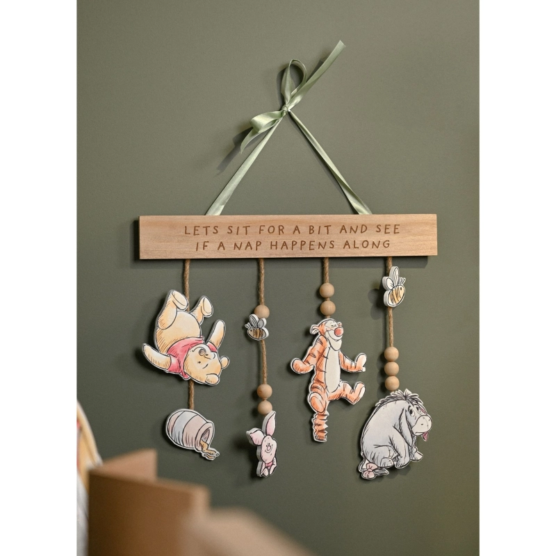 Breng warmte en zachtheid in de baby- of kinderkamer met deze charmante houten wandhanger, geïnspireerd op de wereld van Winnie the Pooh. De hanger bestaat uit meerdere lieve figuren — waaronder Pooh, Tigger, Piglet en Eeyore — die speels bungelen aan stevige koorden met houten kralen.