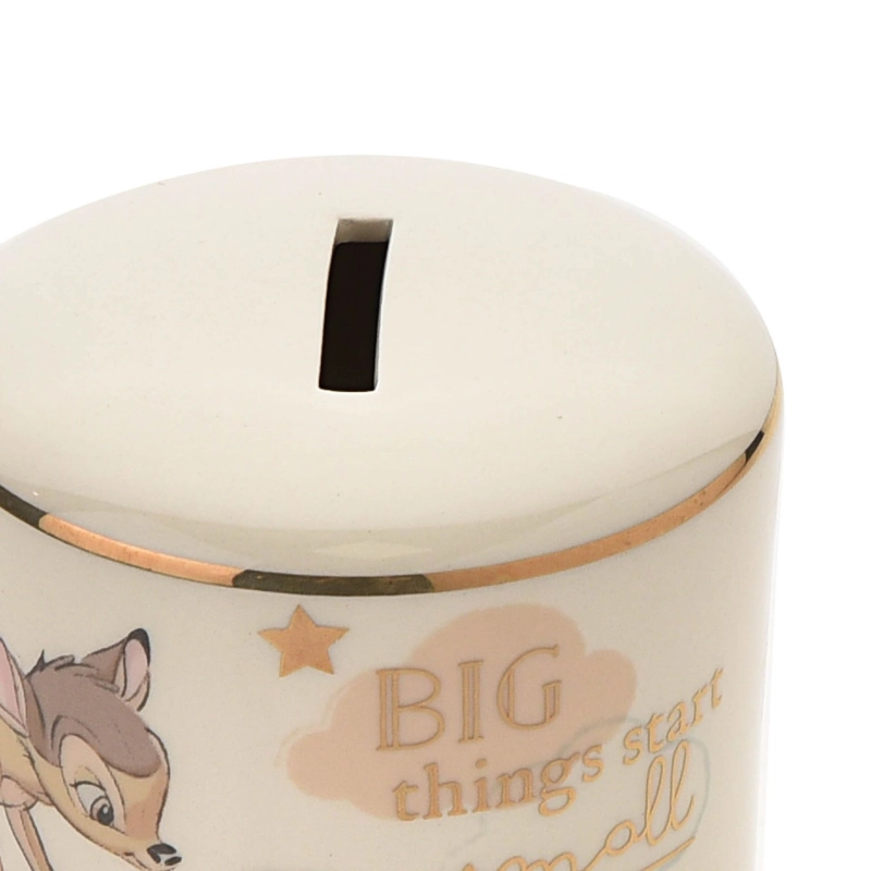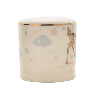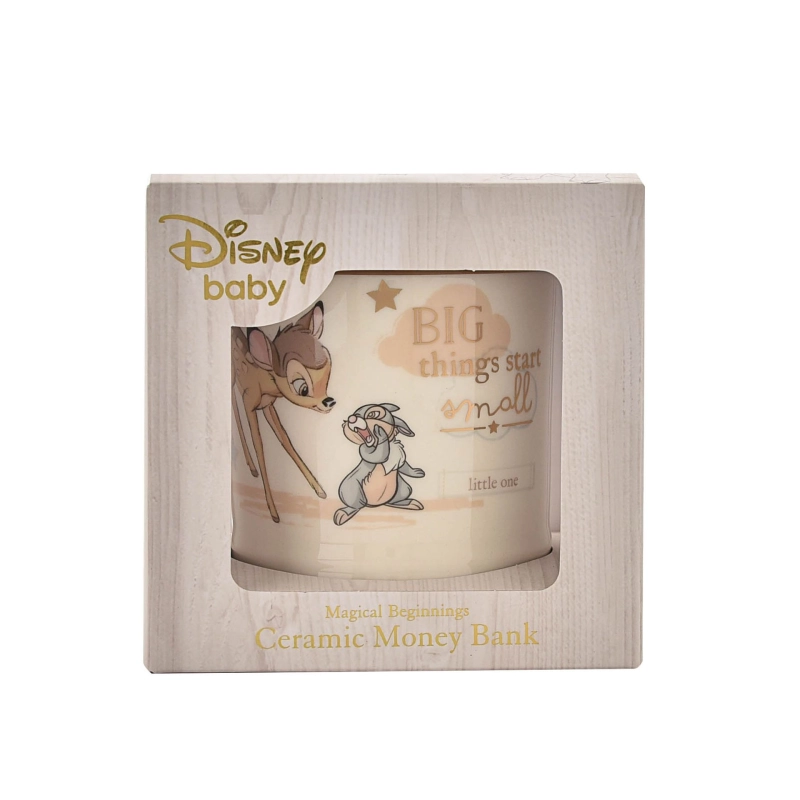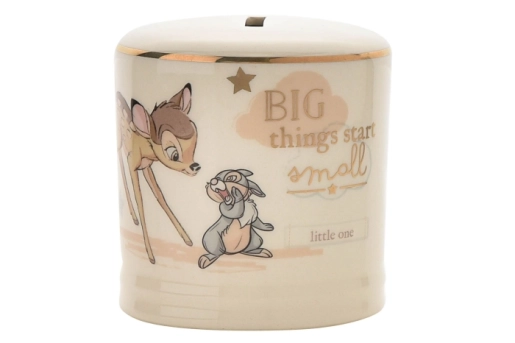 Met deze charmante keramische spaarpot uit de Magical Beginnings-lijn haal je het klassieke Disney-verhaal van Bambi in huis. Het potje is voorzien van een lieve illustratie van Bambi en Stampertje, afgewerkt met een glanzende coating en goudfolie-accenten. De tekst op de spaarpot — “Big things start small” — maakt hem perfect als eerste spaarpot voor kinderen of als symbolisch cadeau bij speciale momenten.