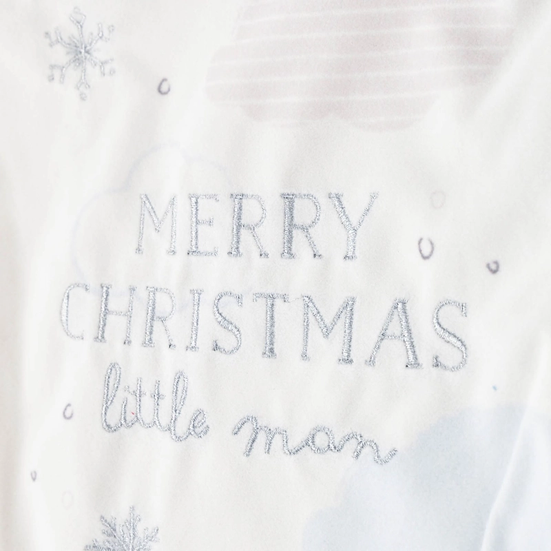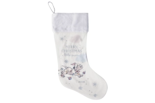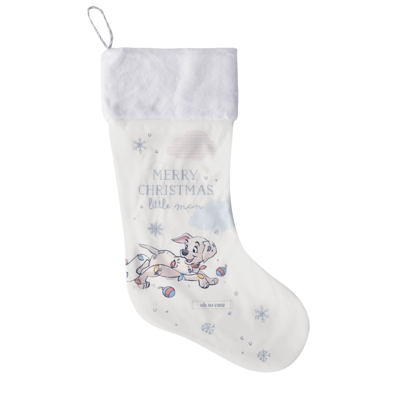 Deze charmante stoffen kerstsok uit de Disney-collectie is versierd met een herkenbare afbeelding van de 101 Dalmatians en de feestelijke tekst “Merry Christmas Little Man” in glinsterende letters — perfect voor een eerste kerst of als bijzondere kerstdecoratie in je woonkamer. De sok is gemaakt van zachte stof met een helder witte ondergrond en is afgewerkt met een lus om op te hangen aan de schouw, muur of kinderbed.