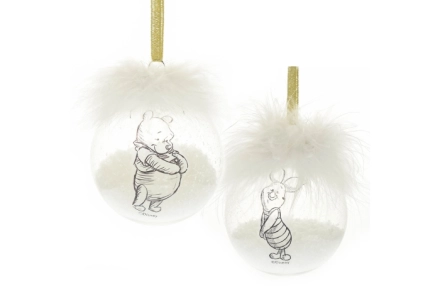 Deze charmante set van twee kerstballen van acryl met wit verenaccent is de ideale decoratie voor de feestdagen. Dankzij de populaire figuren uit de wereld van Pooh en Piglet voeg je een speels en nostalgisch tintje toe aan je kerstboom — perfect voor Disney-fans en liefhebbers van warme, cosy kerstdecoratie.