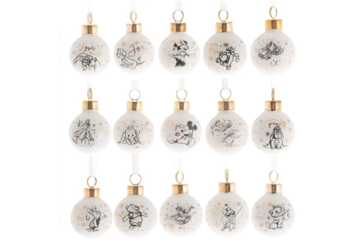 Deze set van 15 keramische kerstballen brengt de charme en nostalgie van klassieke Disney-figuren in huis. Elke bal is met zorg vervaardigd in hoogwaardige witte keramiek, versierd met subtiele goudfolie-decalcomanieën en voorzien van een goud glitterlint zodat je ze meteen kunt ophangen. De set wordt geleverd in een stijlvolle verpakking – ideaal als cadeau of om je eigen kerstdecor elegant aan te kleden.