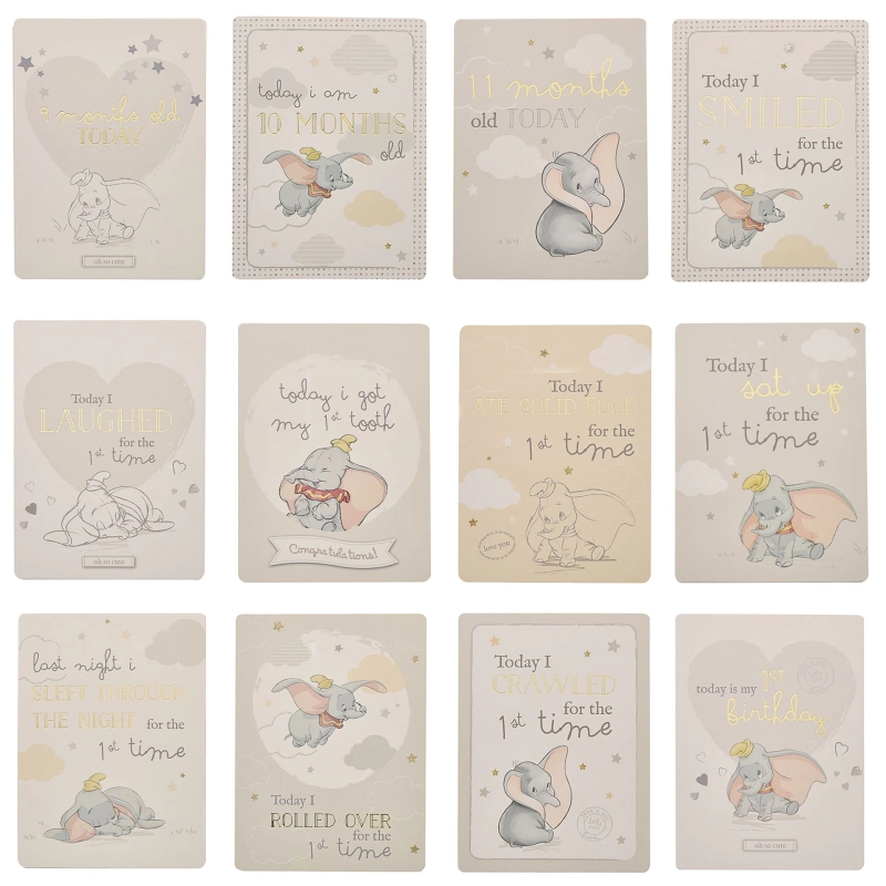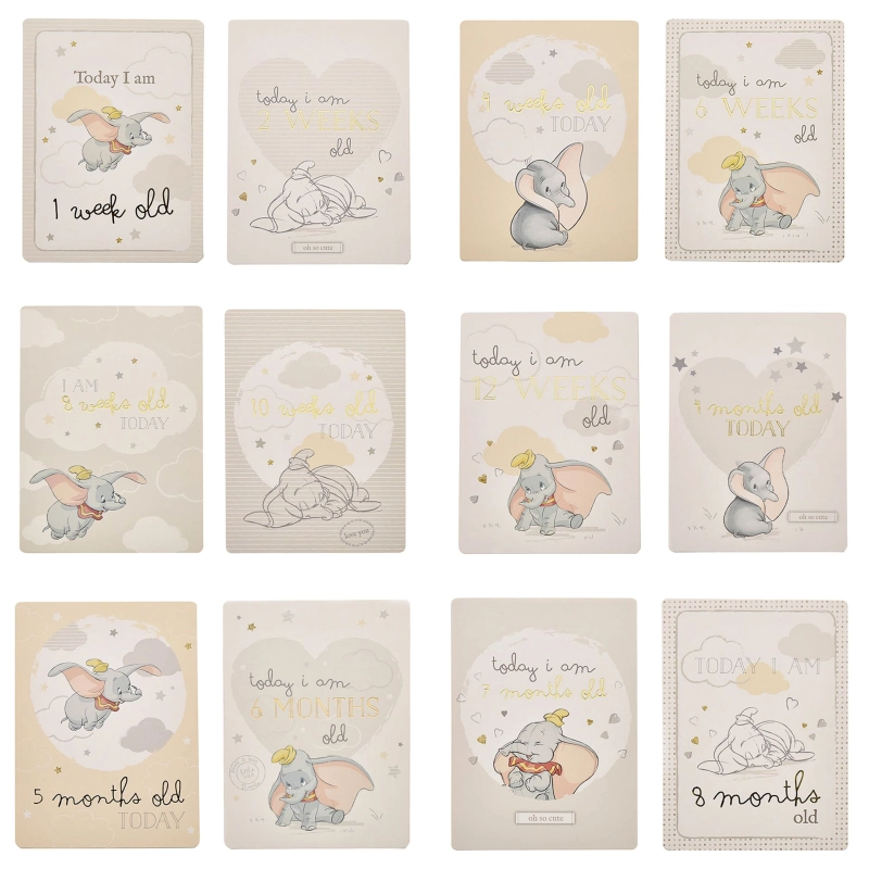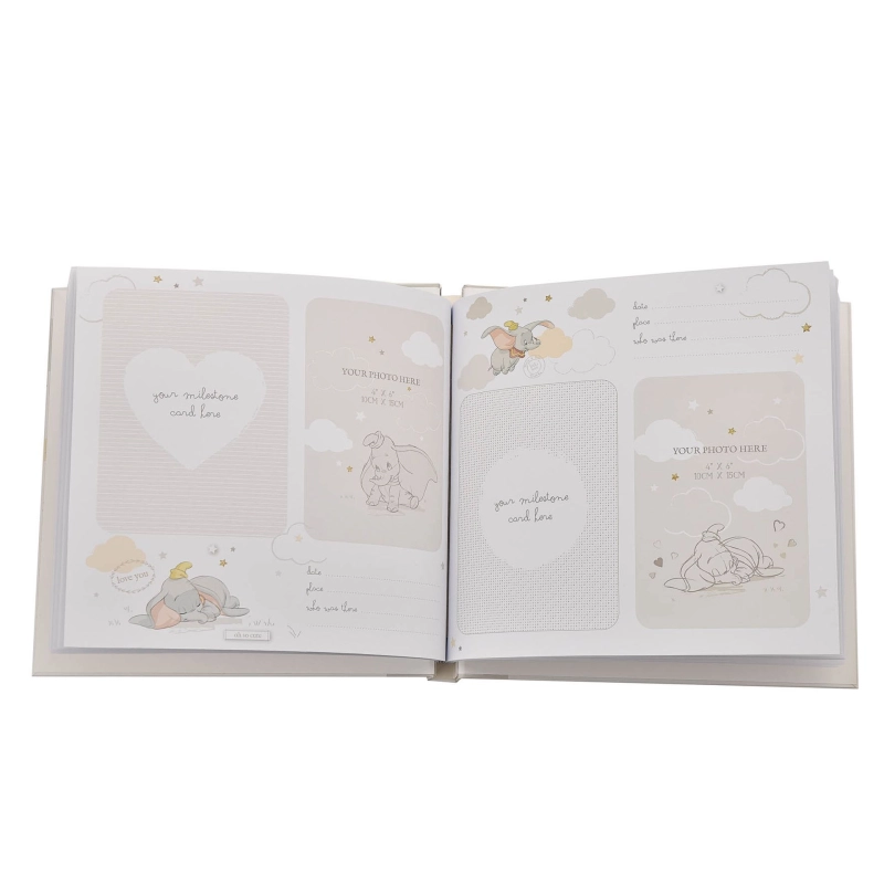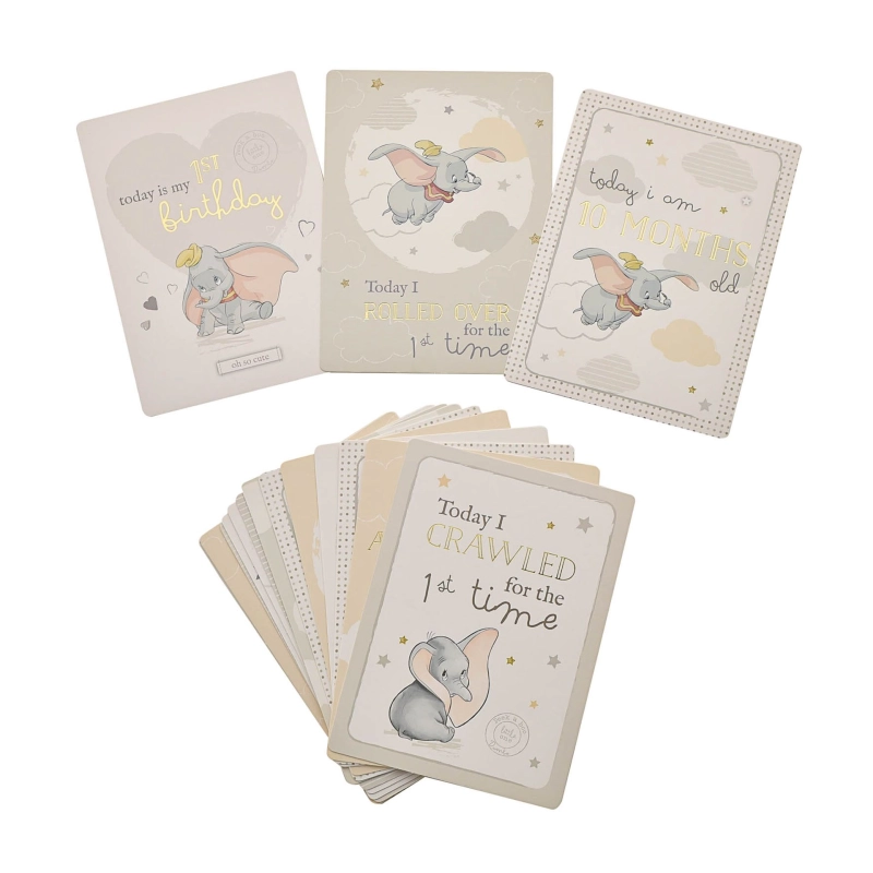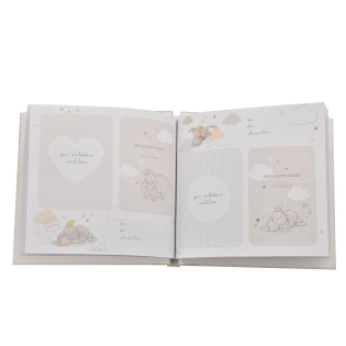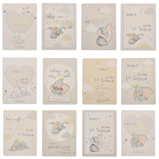 Het album en de kaarten zijn prachtig vormgegeven met zachte pastelkleuren en lieve illustraties van Dumbo. Op de kaarten staan teksten zoals "Mijn eerste lach" en "Mijn eerste stapjes" – perfect om samen met foto’s te bewaren als kostbare herinnering.