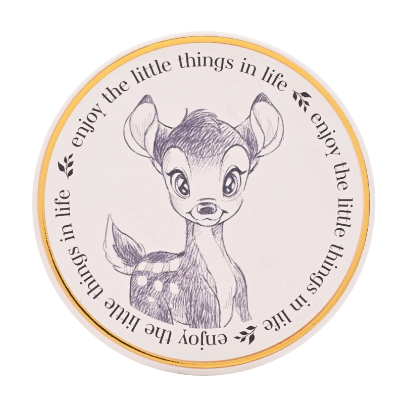 Voeg op subtiele wijze een vleugje nostalgie en charme toe aan je woonruimte met deze elegante onderzetter geïnspireerd op het iconische karakter Bambi. De mat witte keramische afwerking geeft een moderne uitstraling, terwijl de illustratieve print direct herkentbaar is voor liefhebbers van Disney’s klassiekers.