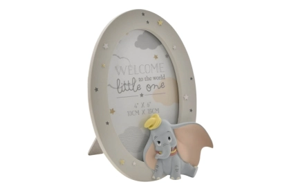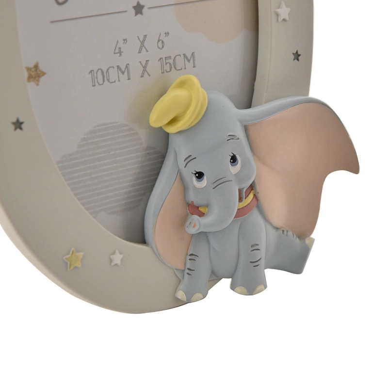 Vier de komst van een kleintje met dit charmante resin fotolijstje uit de Magical Beginnings collectie. Het lijstje heeft een zachte grijze afwerking en toont een 3D-ontwerp van Dumbo met sprankelende sterversiering — subtiel en nostalgisch in stijl, ideaal voor babykamer of kinderkamer.