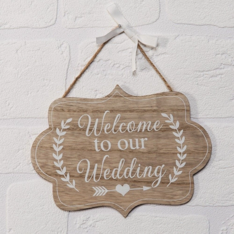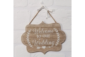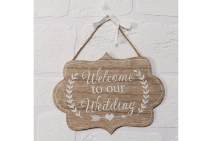 Het licht houten bordje heeft een labelvormontwerp met 'Welcome to our Wedding'-details en is opgehangen aan een touwtje versierd met een strik.
