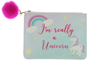 Een prachtige kunstleer Unicorn Magic make-up tas met een roze en blauw ombre effect ontwerp, kleurrijke eenhoorn illustratie en 'I am really a unicorn' titel. De tas heeft een goudkleurige ritssluiting en roze pom pom-decoratie.